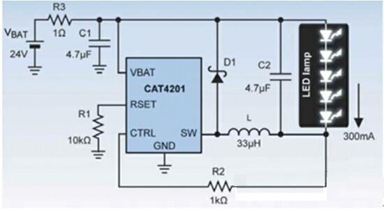 圖2:使用CAT4201驅(qū)動(dòng)5個(gè)1W的LED。