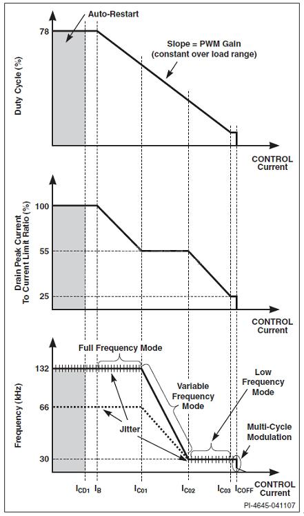 在高負載條件下,TOPSwitch-HX控制器工作于全頻PWM模式,此時用戶既可使用尺寸較小的元件,又可實現(xiàn)高效率。隨著負載的降低,控制器也降低頻率,從而降低開關損耗。它先切換到變頻模式,然后切換到頻率較低的固定頻率PWM模式。當負載極輕時,控制方式從PWM控制模式開始切換,并采用多周期調(diào)制控制算法。TOPSwitch-HX能根據(jù)經(jīng)由光耦器饋入到控制引腳的反饋電流(圖1),自動在各控制模式間切換。