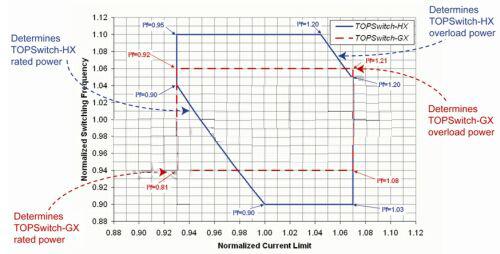 TOPSwitch-HX已解決了上述難題。TOPSwitch-HX引入額外的電路,并在最終測試中采用參數(shù)調(diào)整技術,以控制開關頻率與流限值平方的乘積的最大值和最小值,這在數(shù)據(jù)手冊中用一個新的參數(shù)來表征,即功率因數(shù)(I2f)。