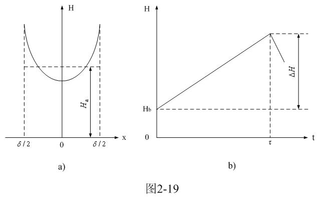 [page]圖2-19-a和圖2-19-b分別是由(2-61)式給出的,鐵芯片中磁場強度按水平方向分布的函數(shù)H(x)和按時間分布的函數(shù)H(t)曲線圖。
