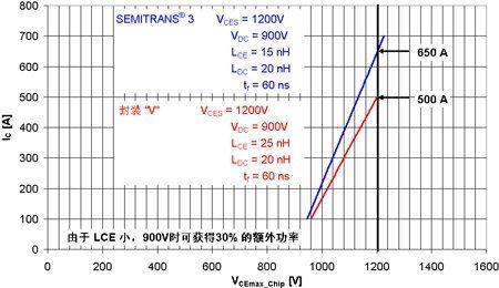 當(dāng)使用低電感模塊時(shí),可以實(shí)現(xiàn)高可靠性和最高效率。圖3顯示SEMITRANS®3和與其作對(duì)比的不同形狀封裝“C”之間的差異。由于模塊的電感小,SEMITRANS®3在芯片的最大反向電壓達(dá)到之前可切換的電流值要高30%。受益于主端子加上用于DCB的對(duì)稱并聯(lián)設(shè)計(jì),SEMITRANS®模塊可實(shí)現(xiàn)低電感(請(qǐng)注意,依托模塊電感,半導(dǎo)體芯片上實(shí)際產(chǎn)生的電壓永遠(yuǎn)高于端子上產(chǎn)生電壓)。