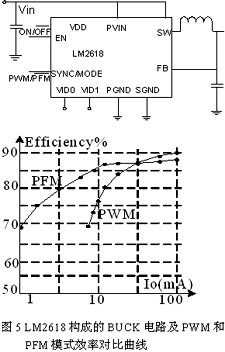 對(duì)于額定功率時(shí)工作在PWM模式的開(kāi)關(guān)電源,,也可以通過(guò)切換至PFM模式提高待機(jī)效率,即固定開(kāi)通時(shí)間,調(diào)節(jié)關(guān)斷時(shí)間,負(fù)載越低,關(guān)斷時(shí)間越長(zhǎng),工作頻率也越低。圖5是采用NS公司的LM2618控制的Buck轉(zhuǎn)換器電路和分別采用PWM和PFM控制方法的效率比較曲線(xiàn)。由圖可見(jiàn),在輕載時(shí)采用PFM模式的電源效率明顯大于采用PWM模式時(shí)的效率,且負(fù)載越低,PFM效率優(yōu)勢(shì)越明顯。