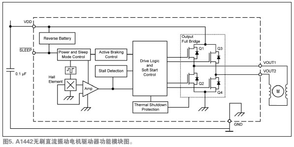 A1442是驅動馬達唯一必須的的IC。圖5所示的功能模塊圖說明了設備運行和先進的特性。注意圖4和圖5中,采用集成的霍爾傳感器免除了外部霍爾傳感器,從而減少了馬達PCB元件數(shù)量。唯一所需的外部元件是一種標準電路特性——位于應用馬達安裝PCB上的0.1µF的旁路電容,它用于降低在開關電源的電感負載時產(chǎn)生的瞬時電壓峰值。