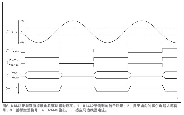 [page]數(shù)字換向與線性軟開關避免了電火花,從而也避免了RFI干擾。Allegro完全集成的A1442霍爾效應傳感器與精密放大器通過比較器電路連接到一個內部全橋輸出電路,該比較器可確定適當?shù)膿Q向點。圖4中馬達的第三條線是可選的,它連接到A1442的啟用針腳(enablepin),用作控制主動制動與睡眠功能。第三線可將IC針腳連接到PCB的VCC。