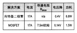 下表比較了在輸出功率為400W(24V,17A)、結(jié)溫為100℃時,采用不同整流器獲得的結(jié)果: