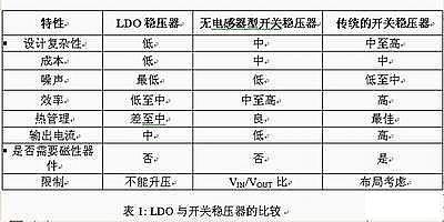 對于可滿足手機(jī)內(nèi)部電源轉(zhuǎn)換需求的不同電壓穩(wěn)壓器,我們必須認(rèn)真考慮它們的優(yōu)缺點(見表1)。目前有三種選擇:線性LDO穩(wěn)壓器、無電感型開關(guān)穩(wěn)壓器(亦稱為充電泵)以及傳統(tǒng)的開關(guān)穩(wěn)壓器(基于電感器)。