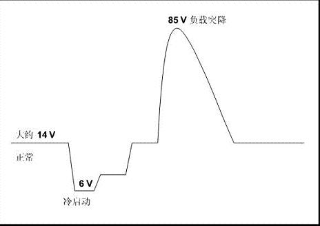 如12V電池電源線的電壓瞬變范圍(VIN)非常寬廣,小至6V,,大至87V。典型的車(chē)載電力系統(tǒng)的工作電壓范圍往往只有在9V~16V。引擎關(guān)閉時(shí)電池的正常額定電壓為12V,啟動(dòng)時(shí)為14.4V。但是,這個(gè)范圍在瞬變狀態(tài)時(shí)很容易擴(kuò)大到80V峰值以上。