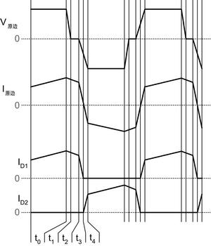 在t0時段結束時,開關QD由UCC2895控制電路關斷,同時開始啟動轉(zhuǎn)換器右手支路的諧振轉(zhuǎn)換,如圖3所示。通過變壓器漏感,原邊電流基本保持為常量。在本文中,變壓器的漏感與外部電感集成在一起,在圖3中標為LResonant。如果變壓器的漏感太小,不能提供實現(xiàn)ZVS所必需的轉(zhuǎn)換時間,那么就需要額外的電感。通過串聯(lián)添加外部電感,就能夠調(diào)節(jié)諧振電感。