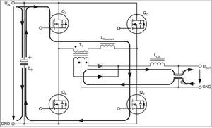 兩個互為對角的全橋開關不是同時驅(qū)動,而是通過相移的方法在啟動命令之間引入預定義的短期延遲。這種延遲由控制電路的電壓回路進行調(diào)節(jié),從而在兩個驅(qū)動信號之間產(chǎn)生相移。這種相移技術的特殊之處在于,它可啟動兩個與變壓器串聯(lián)的開關,而變壓器的電壓卻為零。