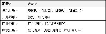 隨著技術(shù)的改善,LED燈具的用途已由過去數(shù)十年單純應(yīng)用在指示燈、信號(hào)燈等,逐步使用在手機(jī)背光源、車內(nèi)用照明、煞車燈、LCD電視、手提電腦背光源等輔助照明;而在近兩年內(nèi),其開始成為主照明系統(tǒng),所應(yīng)用的范疇可涵蓋建筑、戶外、商業(yè)、及居家等,產(chǎn)品則分別有: