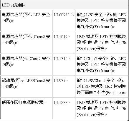 4.其它要求:如LED電源、LED數(shù)組、LED模塊及LED控制模塊等安全及外殼要求等。LED的電源可以是下列標(biāo)準(zhǔn)所驗(yàn)證的電源供應(yīng)器,包括UL1012,UL1310及UL60950-1?;旧?,LED數(shù)組、LED模塊及LED控制模塊只要位于LPS/Class2安全回路上,就沒有任何電氣外殼的要求。LED燈具對(duì)于電源輸出方式的規(guī)定為基本絕緣,與完全沒有隔離是一樣的。對(duì)于LED數(shù)組、LED模塊及LED控制模塊,如果使用的電源不用大到超過LPS/Class2,建議最好要符合LPS/Class2。反之,若使用的能量將大于LPS/Class2,則有沒有提供隔離一次側(cè)與二次側(cè)電源電路的絕緣,對(duì)塑料外殼的要求上,是沒有差別的。