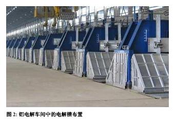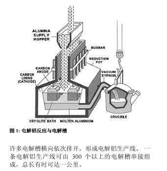 電解槽為大而淺的鋼槽,內(nèi)側(cè)襯有碳層,不同電解槽在電氣上為串聯(lián)連接。每個電解槽中,直流電流經(jīng)石墨陽極流入呈融化狀的氧化鋁電解液,然后經(jīng)電解槽內(nèi)襯的碳陰極流出,進入下一電解槽的陽極,依次類推。在電流的作用下,氧化鋁中的氧元素被分離出來,并在電解槽上部與碳化合形成二氧化碳,而在電解槽底部析出液態(tài)的鋁。以上生成過程見圖1。