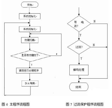 軟件控制程序由主程序和過(guò)流保護(hù)程序兩部分,其主要實(shí)現(xiàn)步進(jìn)加減、D/A 轉(zhuǎn)換、鍵盤 掃描、LED 顯示、電流報(bào)警等功能。
