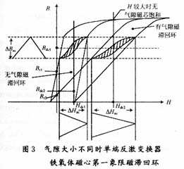 與正激開關(guān)電源變壓器不同,此反擊電源變壓器兼有儲(chǔ)能的作用,流過(guò)直流電流成分時(shí)容易飽和。所以要使用帶有氣隙的磁芯。原理如圖3所示。
