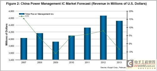 據(jù)iSuppli公司,繼2009年經(jīng)濟(jì)成長(zhǎng)放緩之后,預(yù)計(jì)未來(lái)幾年中國(guó)電源管理IC(PMIC)市場(chǎng)將強(qiáng)勁擴(kuò)張,吸引更多的國(guó)內(nèi)企業(yè)加入。
