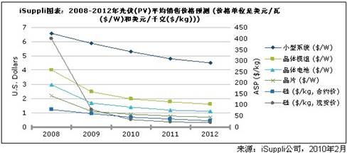2010年將保持這種趨勢,盡管價格下跌速度可能減慢。晶體組件價格將下降20%,晶片價格將下滑18.2%,多晶硅將下跌56.3%。