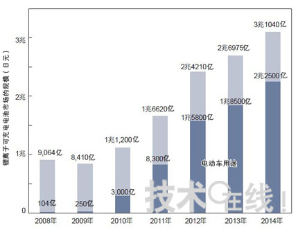 5年內(nèi)成長(zhǎng)90倍——鋰離子充電電池市場(chǎng)正處于大轉(zhuǎn)型期。在被電動(dòng)車(chē)(EV)采用后,預(yù)期鋰離子充電電池市場(chǎng)在未來(lái)5年內(nèi)將超越3萬(wàn)億日元。技術(shù)發(fā)展的激烈競(jìng)爭(zhēng)已展開(kāi),一系列新加入公司使得情況更為熱鬧。