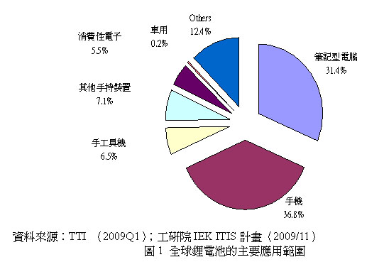 根據(jù)IIT的銷售統(tǒng)計,全球鋰電池芯的44%用在手機及手持裝置、31.4%用在筆記型電腦及5.5%用在其他消費產(chǎn)品,此三種應(yīng)用已涵蓋80%的鋰電池芯需求,主要應(yīng)用統(tǒng)計如圖1。