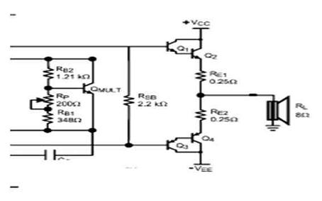 射極電阻器RE:在高功率的音訊放大器應(yīng)用中,輸出晶體管的匹配性、電流平衡和保護(hù)對(duì)于功率放大器的線性度來說非常重要。建議采用射極負(fù)反饋電阻器RE來改善輸出晶體管的匹配性和電流平衡能力。因此,我們建議在實(shí)際的高功率音訊放大器應(yīng)用中加入這種電阻。然而,將RE與輸出晶體管串聯(lián)在一起會(huì)降低放大器的線性度。電阻RE是交越失真的主要失真來源。當(dāng)輸出晶體管的一端關(guān)閉而另一端開啟時(shí)便會(huì)出現(xiàn)這種失真。因此,必須最佳化RE值并且盡可能的將RE維持在較低水平,這樣可以降低對(duì)非線性度的影響。