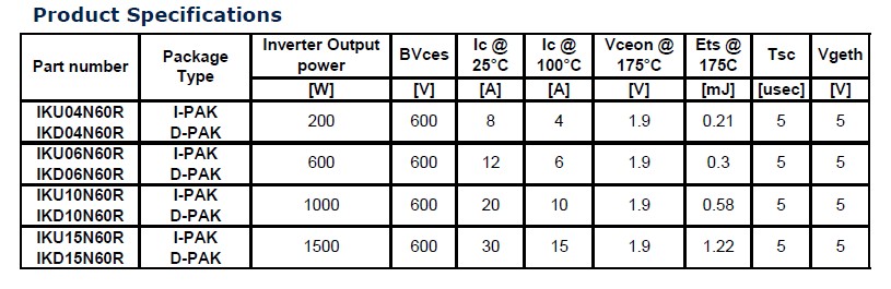 目前這種逆向?qū)ㄐ虸GBT有兩種封裝形勢,一種是IPAK封裝,另外是DPAK封裝,電流有4安、6安、10安和15安四個等級。它主要的特點就是有非常低的價格,還有節(jié)省空間。半導(dǎo)體器件它的成本主要取決于兩個方面,一個是它的晶圓,減少晶圓的數(shù)量,從兩個晶圓減少到一個晶圓可以減少成本。另外的話,這種T0220的封裝還有這種D2PARK封裝可以減少成IPARK封裝和DPARK封裝,同時減少封裝的成本,減少了封裝的話同樣會減少它的空間,但是減少了晶圓的話會不會對它的性能造成影響?首先我們來看一下,同樣它有一個非常低的飽和導(dǎo)通壓降,對它的性能絲毫沒有任何影響。另外可以通過改變門級驅(qū)動電阻,在寬范圍調(diào)節(jié)它的開通和關(guān)斷的時間,有一個非常好的EMI效果,非常平滑的開關(guān)波形,5us的短路保護能力,最高結(jié)溫可以達到175度。這個是這種逆向?qū)ㄐ虸GBT的主要參數(shù),這個是它的擊穿電壓,這個是它的電流,這是175度飽和導(dǎo)通壓降,這是開關(guān)的能力,這是短路保護的能力,這是它的門級驅(qū)動電壓,基本上對于一個200W的產(chǎn)品可以選擇4安的IGBT,600W的話可以選擇一個6安的,1000W可以選擇一個10安的,1500W的可以選擇15W的產(chǎn)品。