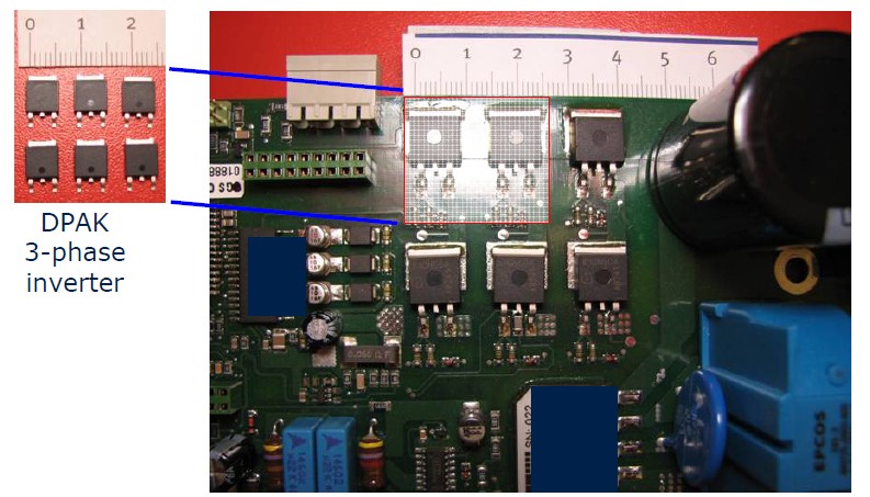 這是一個實際的PCP板上的IGBT的圖,我們看到如果用D2PARK的話,它兩顆的面積大概在2.5厘米,而如果使用DPARK封裝的話可以減少到1.5厘米左右,同時它跟IGBT模塊來相比的話可以節(jié)省0.5個美金的成本,所以對于一些消費類市場低成本的產(chǎn)品這個相當重要的。