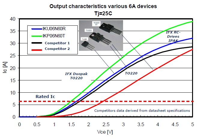 總結(jié)一下IGBT的重要特點,一個是成本,因為它采用的是一個晶圓,所以它的成本有很大的優(yōu)勢;另外因為減少了它的封裝,可以給PCB留下更多的空間,進一步提高產(chǎn)品的功率密度。同時它也有一個非常好的性能,非常低的飽和導(dǎo)通壓降,一個非常軟的開關(guān)特性對EMI非常有幫助,它還有一個很好的溫度特性,最高溫度可以達到175度。藍色曲線是逆向?qū)ㄐ虸GBT和目前TO220封裝的飽和導(dǎo)通壓降的比較。這是用一個6安的產(chǎn)品在做比較,當這個電流在6安的時候可以看到飽和導(dǎo)通壓降非常的低。