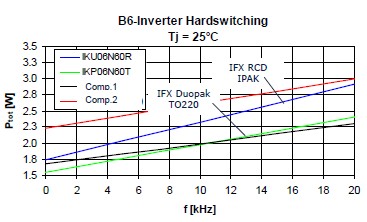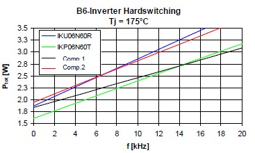 這個是25度損耗的時候,這個是175度損耗的時候,可以看到藍色的這根線,基本上它的損耗跟這個TO220封裝產(chǎn)品相差并不是很大。這個是在基于剛才基礎(chǔ)上做的一個損耗分析,首先頻率在4K赫茲的時候可以看到,這個淺藍色的就是二極管的開關(guān)損耗,這個是二極管的導(dǎo)通損耗,這個是IGBT的開關(guān)損耗,這個是IGBT的導(dǎo)通損耗??梢钥吹皆?K的情況下導(dǎo)通損耗這一部分和這一部分是占了絕對支配地位的。所以對于一個低頻應(yīng)用來說減少它的飽和導(dǎo)通壓降對于IGBT是相當?shù)闹匾?,當它的頻率升高的時候,它的開關(guān)損耗就會稍微升高一點。