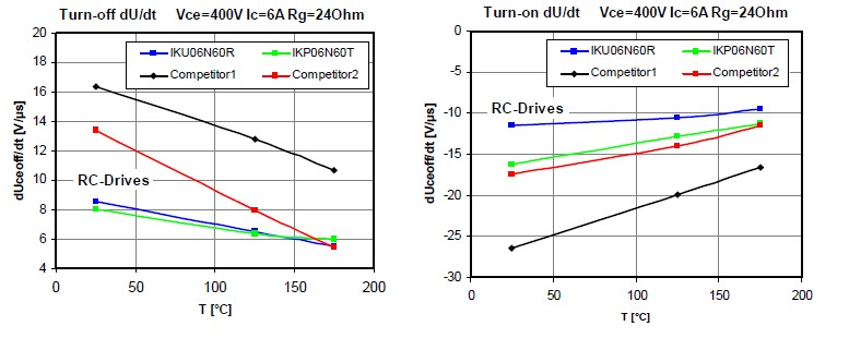 再加上不同的驅(qū)動電阻,這個時候我們也對dV/dt進行了一個測試,然后可以看到基本上我們的dV/dt都比我們的競爭對手或者市面上的產(chǎn)品會優(yōu)異很多。因為減少IGBT的dV/dt的話可以減少前級的EMI濾波器的要求,同樣也可以減少成本,所以這個產(chǎn)品不僅在本身的價格上面有優(yōu)勢,同樣也可以整體的減少系統(tǒng)的成本。