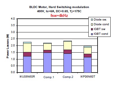 衡量一個IGBT的好壞有兩個非常重要的指標,一個就是它的飽和導(dǎo)通壓降,就是Vce(sat),另外一個就是開關(guān)損耗,也就是Eoff。對于低頻的應(yīng)用來說,飽和導(dǎo)通壓降是占有絕對支配地位的,所以選擇這種RC-Drives的IGBT會是一個非常好的選擇,因為可以看到這種RC-Drives IGBT的飽和導(dǎo)通壓降是遠遠低于市面上的一些產(chǎn)品。這個是在一個無刷電機上面的損耗的分析。