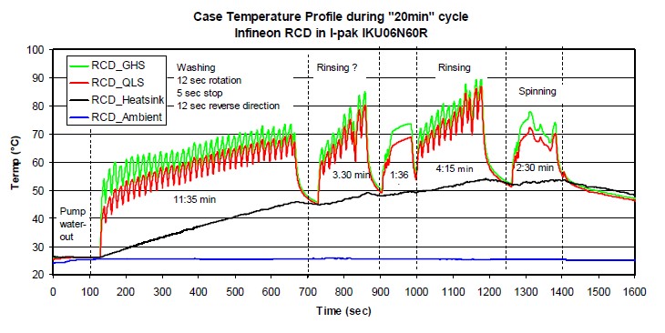 同時跟這種TO220的封裝的IGBT也做了一個溫度的比較,我們會發(fā)現(xiàn)TO220封裝的IGBT溫度會比逆向?qū)ㄐ虸GBT會低10度到15度,但是這個對于IGBT沒有任何影響。為什么呢?因為通常這種TO220的封裝的IGBT最高結(jié)溫是150度,而逆向?qū)ㄐ虸GBT是175度,所以它實際能力還是比這個要高,這是這種逆向?qū)ㄐ虸GBT的優(yōu)勢。為了進一步來確認一下這個溫度的應(yīng)力,然后我們把這個測試放在一個密閉的環(huán)境當中再來看它的表現(xiàn),就是說我們來開動洗衣機使它的環(huán)境溫度平衡在40度這個環(huán)境上,就是從25度上升到40度,然后再來檢測IGBT的溫度,我們?nèi)匀豢梢园l(fā)現(xiàn)基本上它的最高溫度仍然沒有超過90度,所以對于一個結(jié)溫在175度的情況下,它有一個相當大的裕量。