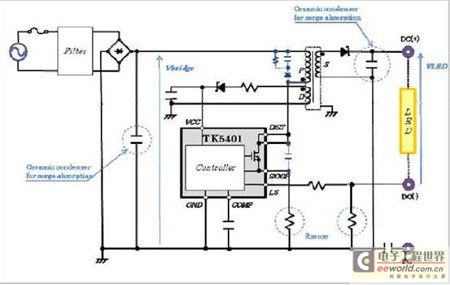創(chuàng)意電子新近推出的TK5401就是這樣一款LED驅(qū)動電源IC,它具有不需要DC電源特性中所必須的電解電容的特性,使得LED壽命高達(dá)4萬小時以上。據(jù)介紹,TK5401封裝內(nèi)置了高電壓功率MOS管及控制電路,因去除電解電容實(shí)現(xiàn)了小型化、低成本,并且實(shí)現(xiàn)了LED燈的長壽命和高效能。