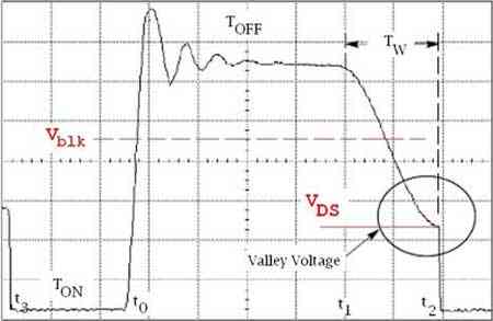 在這一條件下,得到的二次電壓不足以使電壓VDS為零,只是得到了電壓谷值。圖2顯示了準(zhǔn)諧振反激式變換器的典型VVS工作模式。若符合方程1的條件,則谷值電壓將為零,從而獲得ZVS。