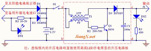 太陽(yáng)能供電板的電路如圖1所示。由D1、BT構(gòu)成系統(tǒng)的太陽(yáng)能充電電路。平時(shí),只要達(dá)到一定光強(qiáng),太陽(yáng)能電池板便通過(guò)二極管D1為充電電池BT充電,直至飽和。除了太陽(yáng)能充電方式外,我還設(shè)計(jì)了備用的外部直流電源充電接口以防不時(shí)之需。外部充電電路由R1、DS1、D2、BT構(gòu)成,R1選用功率為1W的電阻,當(dāng)R1為10歐姆的時(shí)候,最佳外部充電電壓為3-4伏,DS1為外部充電指示燈,它是利用電阻R1上的壓降來(lái)點(diǎn)亮的。后面的升壓電路是運(yùn)用間歇振蕩器的快速關(guān)斷(截止)的特性而實(shí)現(xiàn)升壓的。S1為供電開(kāi)關(guān),當(dāng)S1閉合后升壓電路開(kāi)始工作,太陽(yáng)能供電板便可驅(qū)動(dòng)負(fù)載,J1為輸出接口,DS2是輸出指示燈。