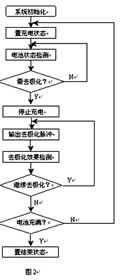 整個系統(tǒng)的控制過程為:蓄電池組開始充電一段時間后,檢測電池電壓,當達到電池出氣點電壓(約2.4V/單體)時,停止充電,然后進行大電流(約2C)放電去極化,時間為1ms,充放電曲線如圖3所示。放電后,再檢測電池狀態(tài),進行去極化效果檢測,達到去極化效果則回轉充電,否則,再次進行去極化放電,直至達到去極化要求的效果才回轉充電。如果連續(xù)放電n次(n=3),電池電壓變化很小,則充電完成并結束充電狀態(tài)。