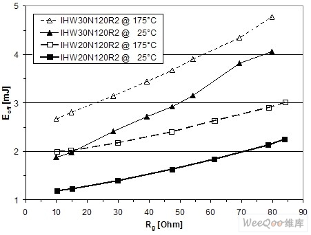 在典型飽和壓降Vce(sat)=1.6V@25℃/1.85V@175℃和典型正向電壓Vf=1.25V@175℃(額定電流)的條件下,功率損(特別是軟開關應用的導通損耗)可大幅度降低。由IHW20N120R2的下降時間的切線可看出高速度—tf=24ns@25℃和Rg=30Ω(44ns@175℃)。IHW30120R2在下降時間方面是最為出色的:tf=33ns@25℃,Rg=30Ω;tf=40ns@175℃。(在硬開關條件下測量,參見帶有Eoff曲線的圖6和圖7)。[page]