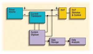 在用于執(zhí)行電池消耗分析的理想系統(tǒng)中(如圖1所示),需要的第一個要素是一種將DUT放入適當(dāng)?shù)墓ぷ髂J街羞M(jìn)行目標(biāo)測試(DUT激勵)的方法。對于移動電話而言,通常會使用基站仿真器。