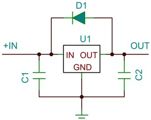 另一個動態(tài)性能變量是輸出噪聲。通過增加穩(wěn)壓器輸出端的濾波器電容一般可以降低輸入紋波和輸出噪聲,但是會延長瞬態(tài)恢復(fù)時間。線性穩(wěn)壓器的運(yùn)行依賴于一個內(nèi)部增益級。為了防止該增益級出現(xiàn)振蕩,通常會需要一個最小輸出濾波器電容(請參見圖1中的C2)。一個輸入濾波器電容(請參見圖1中的C1)將有助于穩(wěn)壓器服務(wù)于瞬態(tài)負(fù)載,尤其是在穩(wěn)壓器遠(yuǎn)離電源時更需要這樣一個輸入濾波器電容。許多穩(wěn)壓器都不容許存在反向電壓。如果輸出電容被充電至輸出電壓,同時輸入短路至接地,那么穩(wěn)壓器將出現(xiàn)反向電壓,并且在所有電路獲得放電以前穩(wěn)壓器都會鎖閉在某種未知狀態(tài)中。這種故障狀態(tài)可能會引起穩(wěn)壓器自毀。為了避免出現(xiàn)這種故障模式,可能會需要一個反向二極管鉗位(請參見圖3)。