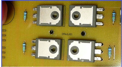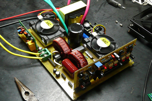 我在裝這臺(tái)樣機(jī)時(shí),曾遇到過(guò)300W以下一切正常,加到300W以上,H橋管子就有一個(gè)燒掉,也曾請(qǐng)朋友幫我診斷和查找原因,后來(lái)是加強(qiáng)了高壓直流和SPWM板電源的濾波就一切正常了