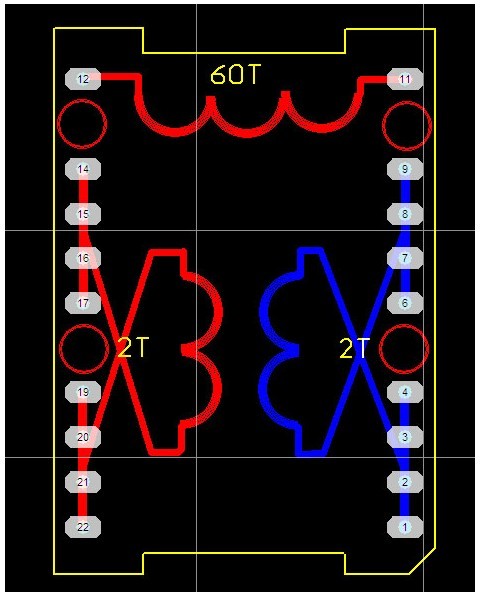 先用5根0.93線(xiàn)繞2圈(見(jiàn)圖二中紅線(xiàn)),中間留空隙,再在空隙處用另外5根線(xiàn)繞2圈(見(jiàn)圖二中藍(lán)線(xiàn)),每根線(xiàn)長(zhǎng)約37CM。用同樣的方法繞二層,層間包二層膠帶,這樣就相當(dāng)于用了10根線(xiàn)并繞。繞完低壓繞組,在繞組外用高溫膠帶包三層。繞低壓繞組要注意的問(wèn)題是:線(xiàn)頭留在下面,即骨架引腳處,線(xiàn)尾留長(zhǎng)一點(diǎn),暫時(shí)留在骨架的上面(等繞完高壓繞組后要向下折下來(lái))。從(圖一)可以看出,實(shí)際上,低壓繞組的頭和尾是有一段是重疊的,也就是不是2圈,而是約2.2圈,這樣做可以大大減少漏感。