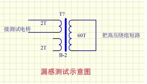 我發(fā)現(xiàn)用這種方法繞制的變壓器漏感比較小。以前用銅帶繞制,漏感一般在0.8uH以上,現(xiàn)在可以做到0.4uH以下。我想原因是:因?yàn)殂~帶要焊引出線(xiàn)頭,這樣就留下了一個(gè)錫堆,再繞高壓繞組時(shí),中間就有一個(gè)空隙,導(dǎo)致耦合不緊。下圖為測(cè)試漏感示意圖。