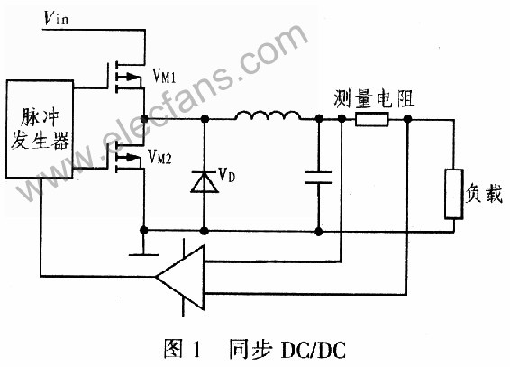 [page]Vin為輸入電壓,VM1、VM2為MOSFET,VM1導(dǎo)通寬度決定輸出電壓大小,快恢復(fù)二極管和VM2共同續(xù)流電路,整流管的導(dǎo)通損耗占據(jù)最主要的部分,因此它的選擇至關(guān)重要,試驗中選用通態(tài)電阻很低的M0SFET。電感、電容組成濾波電路。測量電阻兩端電壓與給定值比較后,通過脈沖發(fā)生器產(chǎn)生相應(yīng)的脈寬,保持負(fù)載電流穩(wěn)定。VM1關(guān)斷,快恢復(fù)二極管工作,快恢復(fù)二極管通態(tài)損耗大,VM2接著開通續(xù)流,減少系統(tǒng)損耗。