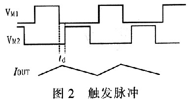 ;VM1關(guān)斷,電流通過VD續(xù)流,接著VN2導(dǎo)通。由于VM2的阻抗遠(yuǎn)小于二極管阻抗,因此通過VM2續(xù)流。VMl、VN2觸發(fā)脈沖如圖2所示。圖2中td為續(xù)流二極管導(dǎo)通時間。