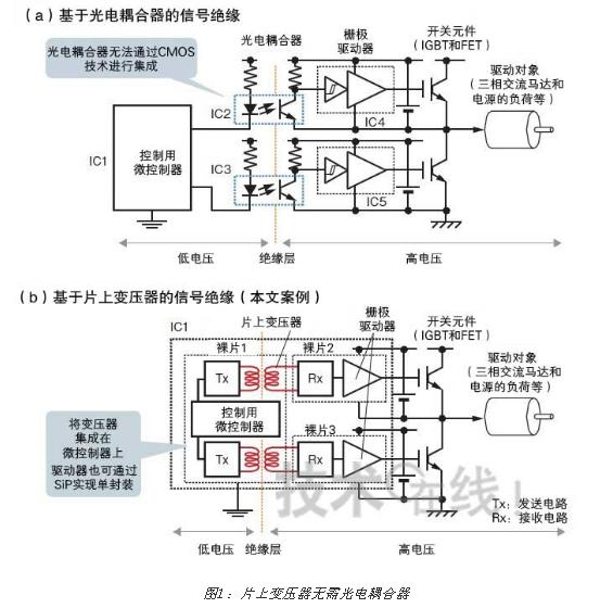 在絕緣型開關(guān)電源和交流馬達(dá)的驅(qū)動(dòng)電路中,PWM信號(hào)等的絕緣一直使用光電耦合器(a)。如果能夠使用片上變壓器的話,就可以集成在微控制器上,因此可以大幅削減部件個(gè)數(shù)(b)。圖是根據(jù)瑞薩電子的資料制作而成的。