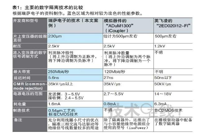 美國模擬器件(ADI)、美國芯科實(shí)驗(yàn)室(Silicon Laboratories)以及德國英飛凌科技(Infineon Technologies)等已經(jīng)使采用片上變壓器的隔離器實(shí)現(xiàn)了實(shí)用化。此次技術(shù)與這些現(xiàn)有技術(shù)的不同之處在于,考慮到要集成在廉價(jià)的微控制器上,將變壓器的面積減小到了原來的1/4左右。具體情況是,通過電路技術(shù)的改進(jìn),將原來需要500μm左右的變壓器直徑降至230μm(表1)。