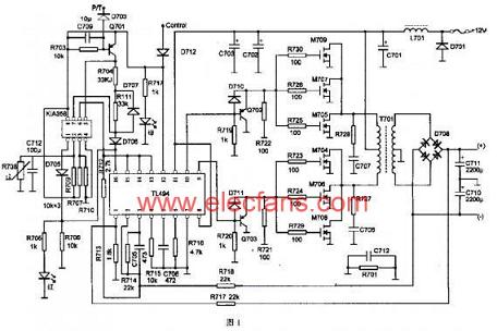 運(yùn)放A1作為過流保護(hù)用,6腳由TL494的14腳提供5V參考電壓。正常情況下,P/T端為高電平,5腳為低電平,所以7腳輸出低電平,TL494的16腳也為低電平。當(dāng)由于運(yùn)放出現(xiàn)過流或其它原因而使P/T端檢測(cè)到低電平時(shí),5腳為高電平,且高于6腳參考電平,7腳便輸出高電平,保護(hù)動(dòng)作。運(yùn)放A2作為開機(jī)保護(hù)和過熱保護(hù)用,同相輸入端3腳電壓由控制電壓12V經(jīng)兩電阻R707和R709分壓獲得。反相輸入端電壓由R710和熱敏電阻R708分壓獲得。R708在常溫下阻值為100kΩ左右,2腳電平高于3腳電平,1腳便輸出低電平。當(dāng)溫度升高到近100℃時(shí),熱敏電阻阻值降為低于10kΩ。2腳電平低于3腳電平,輸出翻轉(zhuǎn),保護(hù)動(dòng)作,紅色發(fā)光二極管亮。電容C712作為開機(jī)保護(hù)用,開機(jī)瞬間C712充電,而使2腳電平低于3腳電平,這時(shí)保護(hù)動(dòng)作,紅色發(fā)光二極管亮。