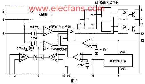 死區(qū)時(shí)間由4腳電壓來(lái)設(shè)定,范圍為0~3.3V之間。誤差放大器A1作為輸出電壓取樣誤差放大,結(jié)果通過PWM比較器控制脈寬使輸出電壓穩(wěn)定。誤差放大器A2作為保護(hù)控制用,15腳接參考電壓5V(由14腳提供),16腳為控制輸入。在開機(jī)保護(hù)、過溫或過流保護(hù)時(shí),16腳為高電平,這時(shí),誤差放大器A2輸出高電平,該電平高于振蕩器三角波電平幅值,而使驅(qū)動(dòng)器沒有驅(qū)動(dòng)脈沖輸出,負(fù)載安全停電。