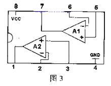 安全保護(hù)電路由KIA358電路來(lái)完成。出現(xiàn)異常情況時(shí)向TL494的16腳提供高電平。KIA358為雙運(yùn)放電路(如圖3)。
