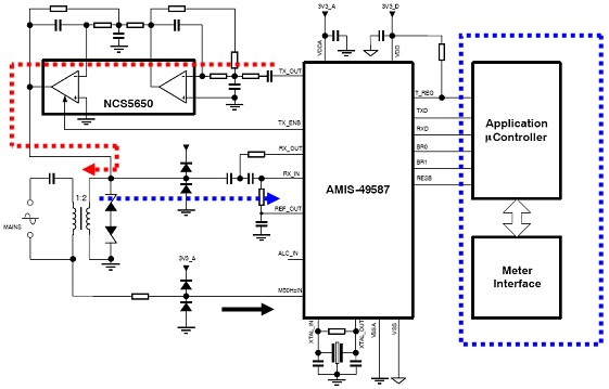 藍(lán)色箭頭表示接收路徑。變壓器從電力線耦合過來的信號經(jīng)AMIS-49587內(nèi)置放大器構(gòu)成的低通濾波器由內(nèi)部ARM進(jìn)行FSK解調(diào)分析。圖中黑色箭頭是50Hz的過零檢測信號引腳。系統(tǒng)依靠這個(gè)信號進(jìn)行同步定時(shí)。圖中藍(lán)色虛線內(nèi)是電表內(nèi)的應(yīng)用處理器,負(fù)責(zé)應(yīng)用層處理通信及計(jì)量。