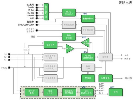 安森美半導(dǎo)體應(yīng)用于智能電表的完整解決方案安森美半導(dǎo)體應(yīng)用于智能電表的方案包含一系列標(biāo)準(zhǔn)產(chǎn)品、專用標(biāo)準(zhǔn)產(chǎn)品(ASSP)及專用集成電路(ASIC),可以提供智能電表的4種基本功能,包括:電源/電源管理、計(jì)量、寄存及通信,具體產(chǎn)品包括功率因數(shù)控制器、交流-直流(AC-DC)控制器、直流-直流(DC-DC)控制器、穩(wěn)壓器,MOSFET、整流器、三端雙向可控硅開關(guān)元件(TRIAC),PLC調(diào)制解調(diào)器、線路驅(qū)動(dòng)器及信號放大器,濾波、輸入/輸出(I/O)及數(shù)據(jù)保護(hù),LCD背光驅(qū)動(dòng)器,EEPROM存儲(chǔ)器,及智能卡接口等。圖2是由安森美半導(dǎo)體的多種器件(圖中綠色部分)構(gòu)成的智能電表應(yīng)用。