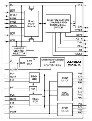 MAX8671XPMIC集成了DC/USB輸入過壓保護(hù)、單節(jié)Li+電池充電器以及電池和外部電源之間負(fù)載切換所需的功率開關(guān)。集成開關(guān)和調(diào)節(jié)器可以省去外部MOSFET以及雜亂的電壓檢測器、電流檢測電阻、比較器、定時(shí)器以及其他常見的用于電源監(jiān)測和切換的分立元件。